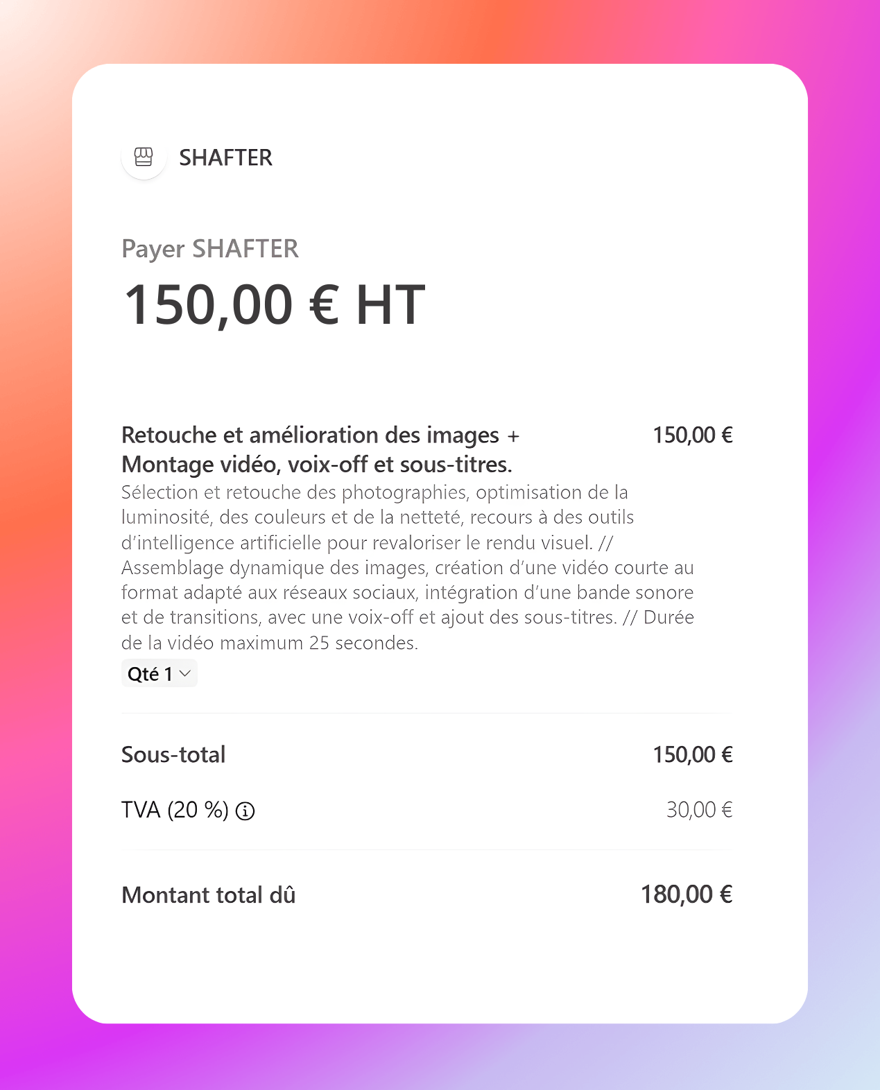 Pour commencer ensemble, il suffit de valider votre commande en cliquant ci-dessous. La prochaine étape c’est de m’envoyer votre contenu en haute qualité avec wetransfer et le lien de votre annonce. Il restera à patienter le temps que je créer votre vidéo.